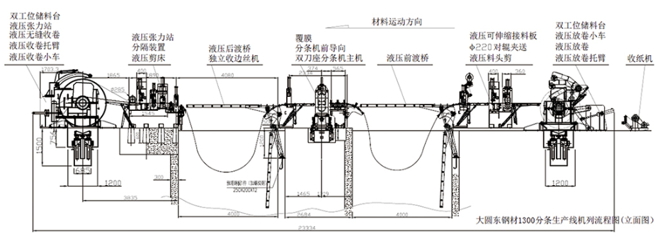 收紙機(jī)一雙工位儲(chǔ)料臺(tái)一上料小車一液壓放卷機(jī)一液壓托臂一接料引頭、鏟頭、二輥夾送+三輥整平、液壓料頭剪一覆膜一活套(前渡橋)一糾偏一壓料一縱剪一廢絲收卷一活套(后渡橋)一預(yù)分料、張力機(jī)一收卷一下料小車—液壓控制—電氣控制;