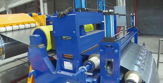 設(shè)備在工作時(shí)送料機(jī)構(gòu)處于被動(dòng)送料狀態(tài),板料通過夾送并經(jīng)板頭液壓剪床剪去不規(guī)則料頭后經(jīng)側(cè)向引導(dǎo)機(jī)構(gòu)進(jìn)入圓盤剪切機(jī)剪切成客戶需要的帶狀條料??v剪過程中,通過廢邊卷取機(jī)對(duì)縱切下來的廢邊迅速進(jìn)行收取成卷狀??v切下來的帶料,通過活套緩沖,并經(jīng)過兩組分離裝置進(jìn)入張力站,通過該張力裝置和卷取機(jī)建立所需的收卷張力,以防止卷取后塌卷。最后由卸料機(jī)構(gòu)把料卷從收料軸上卸到出料小車后運(yùn)出。