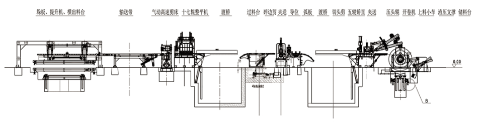 本設(shè)備的工作流程:本設(shè)備是將鋼板(各種金屬材料卷)通過(guò)整平后、定尺橫剪的方式把鋼板加工成客戶需要尺寸的專(zhuān)用剪切設(shè)備。該生產(chǎn)線的主要設(shè)備由收紙機(jī)、液壓上料小車(chē)、開(kāi)卷機(jī)、接料鏟頭、整平主機(jī)、渡橋、NC定尺送料機(jī)、靜電覆紙機(jī)構(gòu)、高速剪床、集料等機(jī)構(gòu)構(gòu)成,中間輔以運(yùn)料、緩沖、引導(dǎo)、輸送、出料等裝置。