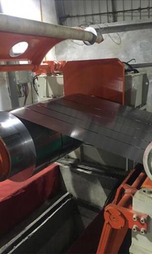 設(shè)備在工作時(shí)送料機(jī)構(gòu)處于被動(dòng)送料狀態(tài),板料通過(guò)夾送并經(jīng)板頭液壓剪床剪去不規(guī)則料頭后經(jīng)側(cè)向引導(dǎo)機(jī)構(gòu)進(jìn)入圓盤剪切機(jī)剪切成客戶需要的帶狀條料??v剪過(guò)程中,通過(guò)廢邊卷取機(jī)對(duì)縱切下來(lái)的廢邊迅速進(jìn)行收取成卷狀??v切下來(lái)的帶料,通過(guò)活套緩沖,并經(jīng)過(guò)兩組分離裝置進(jìn)入張力站,通過(guò)該張力裝置和卷取機(jī)建立所需的收卷張力,以防止卷取后塌卷。最后由卸料機(jī)構(gòu)把料卷從收料軸上卸到出料小車后運(yùn)出。